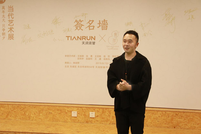 2019年8月12日下午,由天润资管与集祥文化联合举办的“润•十二时辰”当代艺术展,在北京TFC大厦(天润财富中心)•行走的空间开幕。王通、王瑞琳、张勇、王亚彬、周范、慈如荃、田雨亭、赵盈利、徐南生9位艺术家受邀参展,数十部蜚声中外的艺术作品精彩呈现。